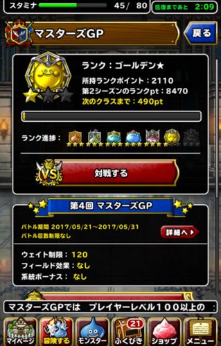 マスターズGP とりあえずゴールデン★まで。 前回のウェイト120と同じPT使ってました。 今シーズンはカイザーランクが解放されましたがまるでやる気ないです。 結局ゴールデンからの降格もあるらしいですし、ゴールデンから負けた時のポイント多いし無理でし…